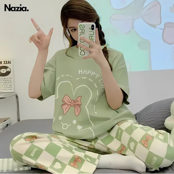Add a touch of cuteness to bedtime with this adorable Girls Nightwear Set. Designed in a soothing pastel green, the set features a round-neck t-shirt with a sweet bunny and bow print, paired with checkered pajama pants decorated with hearts and bows.